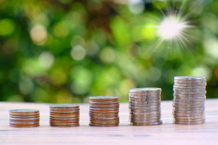 Coins stacked on each other on wooden table with green bokeh background