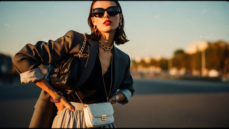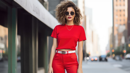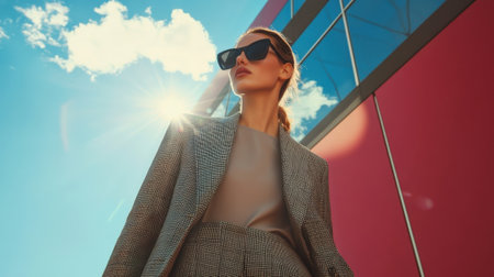Young woman wearing a trendy outfit poses confidently under a clear blue sky in the city.