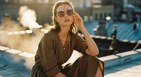 A young woman sitting on a rooftop with sunglasses and a stylish outfit