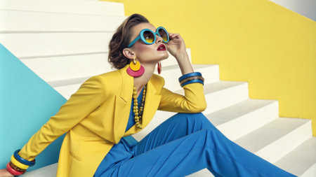 A captivating image of a woman with oversized oval glasses in a dazzling combination of yellow and electric blue. Her stylish jumpsuit and colorful accessories harmonize with the.