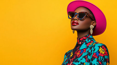 A young woman poses confidently wearing a colorful jacket and stylish sunglasses with a bold yellow wall behind.