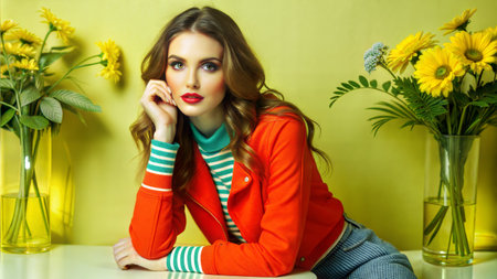 Beautiful woman in a fashionable outfit with bright orange jacket and striped top posing with yellow flowers