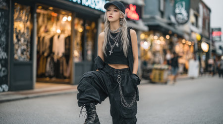 A young woman dressed in urban clothing strolls confidently along a busy street. She wears a crop top and cargo pants, accessorized with chains and hats. Shops are bustling behind her.