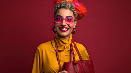 A vibrant and cheerful lady full of zest gazes at the camera with bright eyes and an infectious laugh. She clutches a lively red shopping bag the color resonating with her lively spirit. The woman is not wearing any accessories. Her look is a dynamic mix of vibrant reds and purples. The background is a flat vibrant yellow studio.