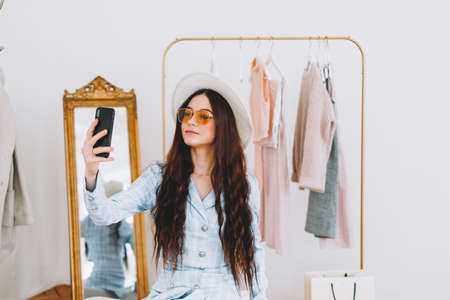 Stylish caucasian young woman in business suit making selfie in fashion boutique while shopping. High quality photo