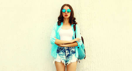 Portrait of stylish young woman model wearing backpack, blue shirt on white background