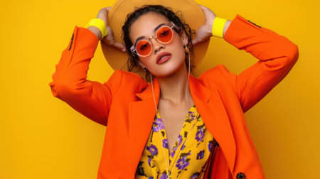 A vibrant portrait of a young woman wearing a bold orange suit and stylish sunglasses, posing confidently against a bright yellow background, radiating energy.