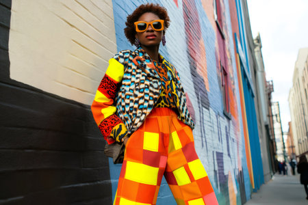 Stylish model showcasing vibrant, patterned outfit against a colorful urban backdrop, embodying modern street fashion