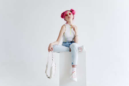 cheerful woman with bright makeup pink hair Glamor posing fun