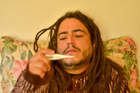 A man with a beard on a blue background holds a thermometer, sick, health, illness.