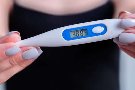 woman in bed with fever focus on thermometer coronavirus or COVID-19 sympthoms