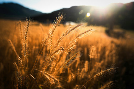 This stunning image captures golden grass blades illuminated by warm sunlight, set against a soft bokeh background, evoking nature's peacefulness and beauty.