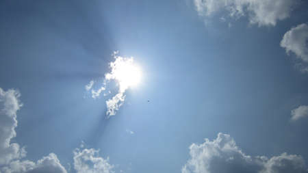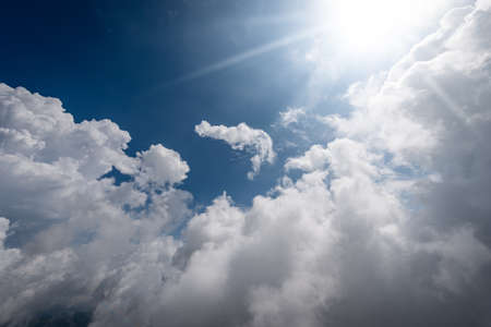 Beautiful blue sky with white cumulus clouds and sun rays, backlight photography,