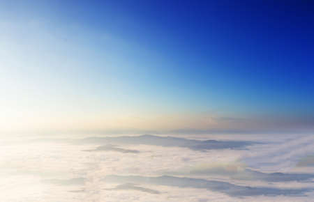 In the skies above the fog. Sunrise over the fog. Clouds near the ground.