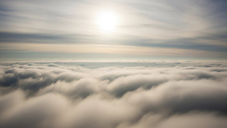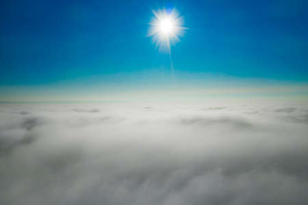 Stock showing aerial view of a vast sea of fluffy white clouds under a bright sunny sky with the sun shining down from above. resolution