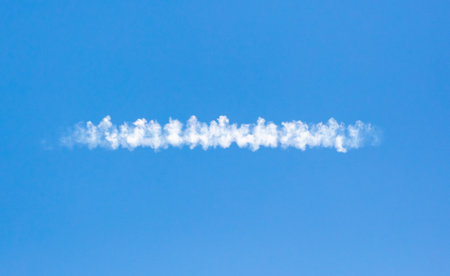 Aircraft condensation contrails in the blue sky inbetween some beautiful clouds