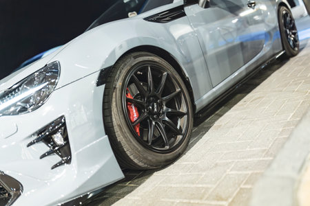 Adria, Italy 30 July 2024: Side view of a gray Toyota GT 86 showing Brembo brakes at night.