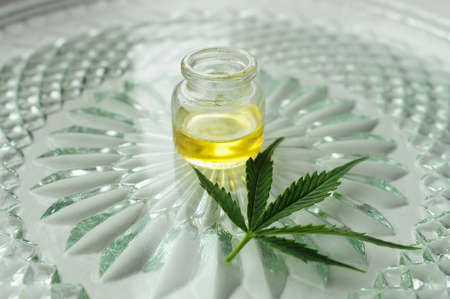 Medical marijuana in little container in hand with black glove. Blurry background with cannabis.