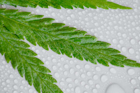 Hemp leaf close-up or cannabis macro, on a light neutral background with lots of water drops or condensation. Top view, flat layout. Template or layout