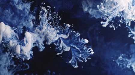 Time-lapse of ink droplets dispersing in clear water forming fractal patterns. Cinematic lighting with deep navy and pearl white contrast