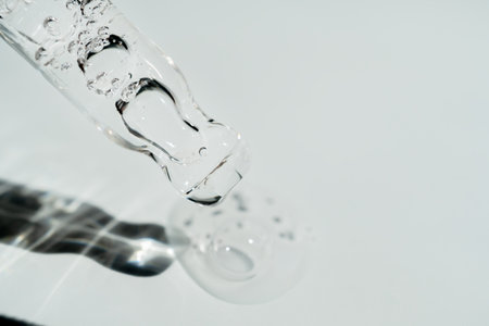 Glass pipette with facial serum on a light background. Essential oil close-up in a pipette. A skin care product with hyaluronic acid in a pipette.
