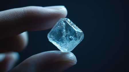 This stunning close-up image captures a hand gently holding a crystal cube, showcasing its unique textures and flaws against a dark background. Perfect for various themes.