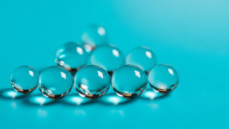 A close-up macro shot of a cluster of clear, translucent blue gel spheres arranged on a vibrant cyan background. The spheres are perfectly round and exhibit a degree of transparency, allowing light to refract and reflect within them, creating subtle highlights and internal glimmers. The smooth, uniform surface of the spheres contrasts with the slightly textured background. conveys a sense of purity, freshness, and scientific or medical applications.