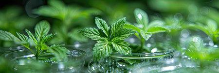 A closeup shot of a plant in a petri dish with water droplets on it, highlighting the presence of moisture. The plant appears to be a terrestrial flowering plant