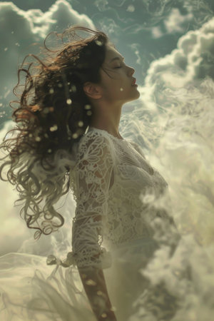A woman in a white dress is standing in the air with her hair blowing in the wind. The image has a dreamy and ethereal quality to it, as if the woman is floating in the sky