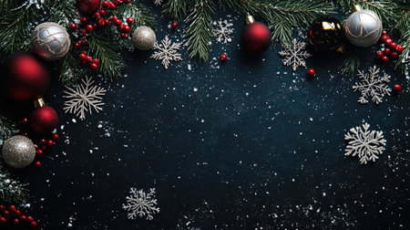 Festive background featuring snowflakes, Christmas baubles, and pine branches on a dark surface, perfect for holiday greetings