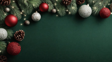 A festive border of pine branches, red and silver ornaments, pinecones, and fairy lights frames a rich green surface, evoking Christmas warmth and seasonal celebration. Generated A.I.