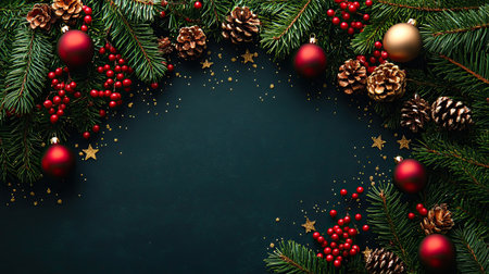 Colorful holiday decoration featuring pine branches, red berries, and golden ornaments arranged around a dark green surface, creating a cheerful and inviting atmosphere.