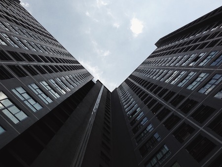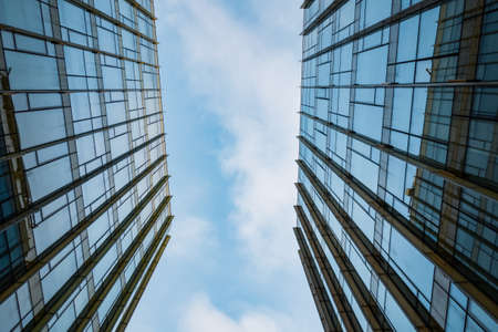 Modern business office building with glass windows reflect the skyline that view from below in Bangkok, Thailand.
