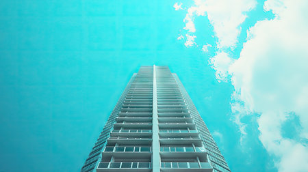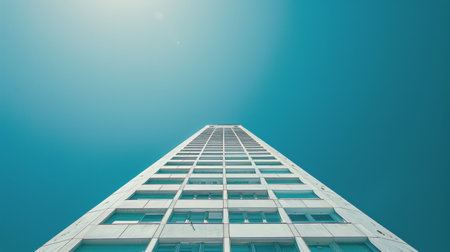 A striking modern high-rise building under a bright blue sky, showcasing contemporary architecture and urban living elements. Ideal for design and real estate projects.