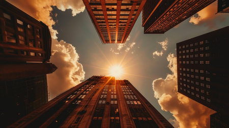 Stunning view of skyscrapers reaching towards sky, framed by dramatic clouds and radiant sun at center. warm glow creates captivating atmosphere, highlighting architectural beauty