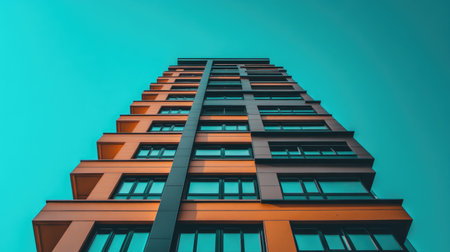 A striking modern building showcasing a vibrant orange facade against a clear blue sky. The perspective emphasizes the height and architectural design of the structure.