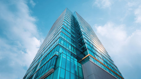 Low angle view of skyscraper with glass windows and blue sky background for business and finance concept. AI Generated