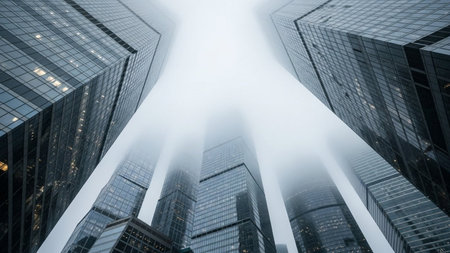 A dramatic perspective of skyscrapers rising through a foggy sky, showcasing modern architecture and reflective glass surfaces in an urban environment.