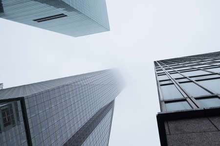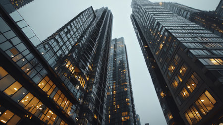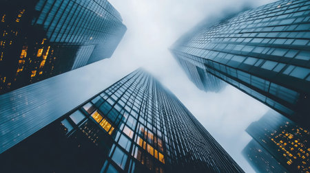 Modern skyscrapers with reflective glass facades stand tall against a misty, overcast sky, captured from a low-angle view; perfect for illustrating urban development and business environments.