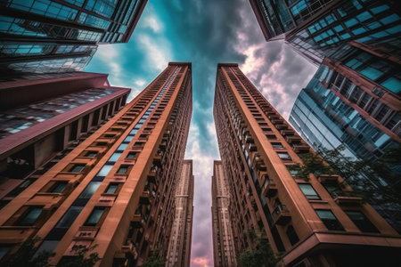 Dramatic vertical perspective of skyscrapers surrounded by stunning architecture in an urban cityscape under a cloudy sky. Captivating geometric view.
