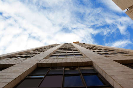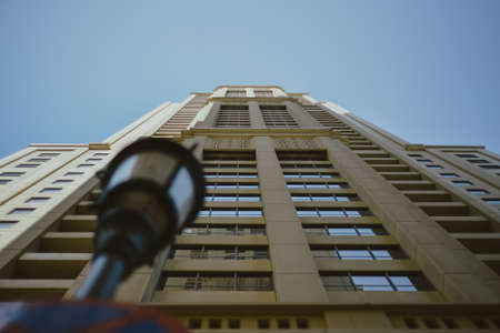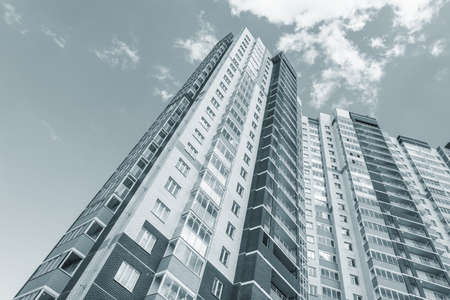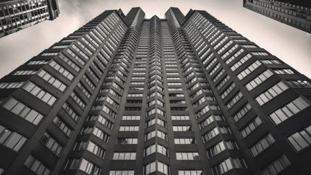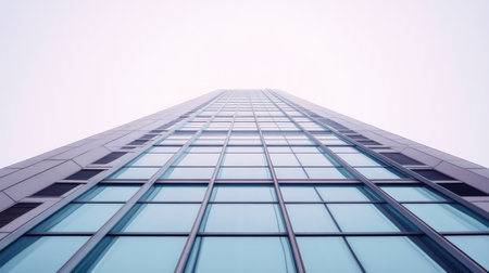 An upward perspective captures tall skyscrapers against a clear sky. The image showcases the repetitive facades of the buildings and emphasizes their height. The color palette consists of neutral tones, possibly depicting a cityscape environment. Suitable for a range of commercial applications, this image conveys urban themes.