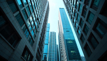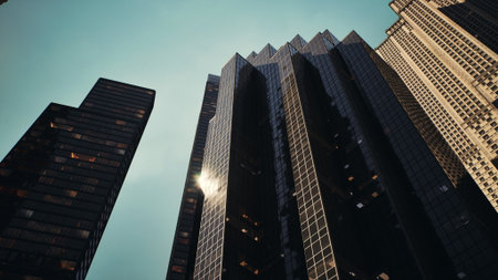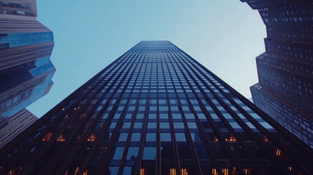 An upward perspective captures a cluster of towering skyscrapers. The buildings exhibit a symmetrical arrangement. The composition highlights the geometric lines. Ideal for visual representations, this image could be suitable for various commercial or editorial applications.