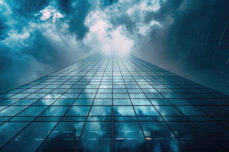 This photo showcases a towering building reaching into the sky with a multitude of windows, Storm clouds casting dramatic shadows on glass skyscrapers, AI Generated