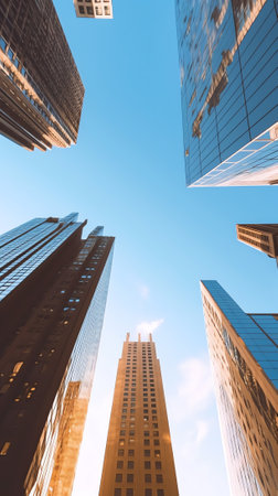 A striking view of tall skyscrapers reaching towards a bright blue sky. The interplay of light and glass creates a vibrant urban scene perfect for city lovers.