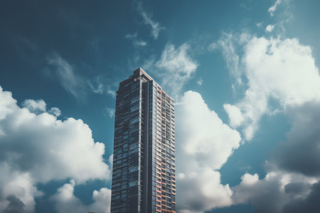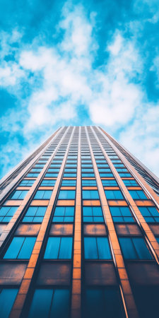 Modern Skyscraper Reaching Towards Cloudy Sky with Vibrant Reflection.