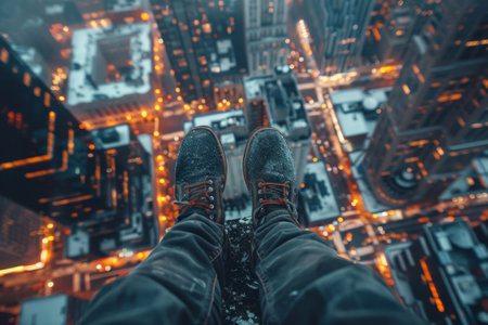 Extreme Angle Shot Looking Down from a Skyscraper, capturing a roofer's leg, creating a sense of scale under the open sky