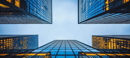 Low-angle view of modern skyscrapers in a city, showcasing urban architecture and cityscapes at dusk or dawn