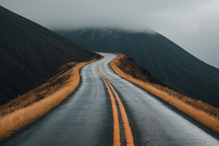 Winding mountain road disappears into the dense fog, creating a mysterious and atmospheric scene. Ai generated image