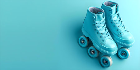 A pair of shiny blue roller skates rests against a minimalist backdrop, capturing the essence of leisure and sports with vibrant colors and a modern design.