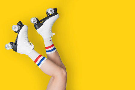 Roller skates on the legs of a urenburg. Retro rollers on a bright background. The concept of childrens outdoor sports. Free space for text. Long format